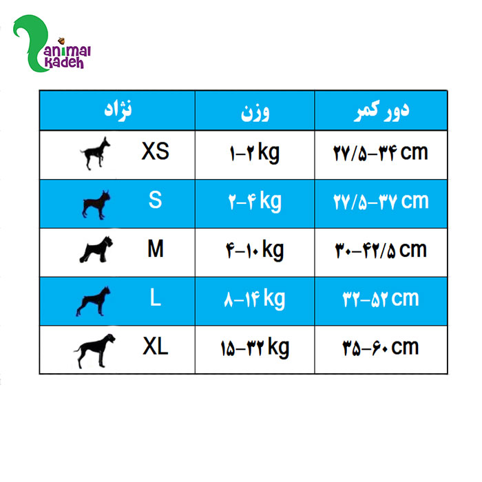 این پوشک ها محصول کشور چین بوده و در 5 سایز با توجه به وزن و اندازه دور کمر سگ ماده برای تمامی نژادهای سگ ماده تولید شده است.